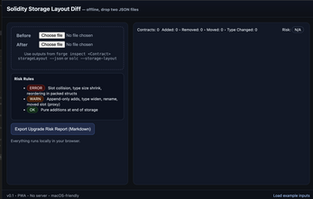 Easily compare two Solidity storage layout JSONs to spot upgrade risks before deployment.
